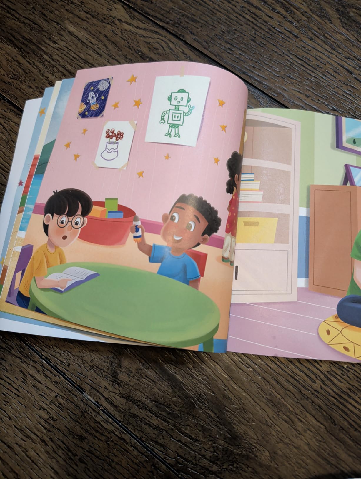 Shows simple, fun alternatives to hitting — like breathing, hugging, and drawing.