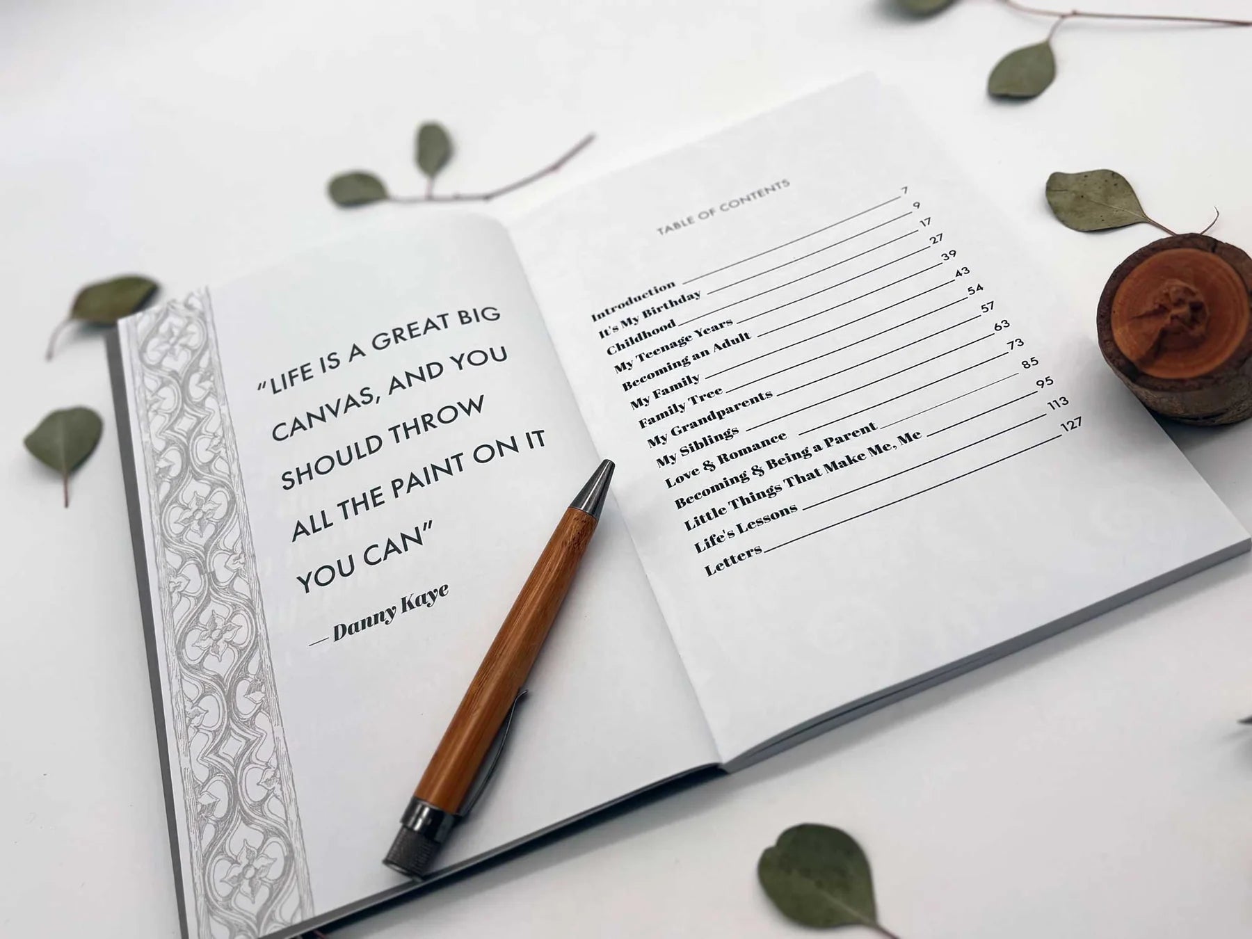 It’s divided into life stages — childhood, teen years, adult life, family, and lessons learned — making reflection natural and organized.